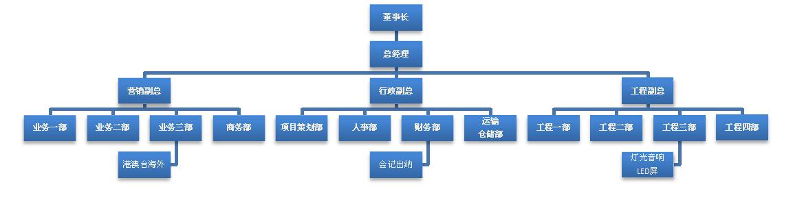 说明: 业务一部:短租业务,地产、会议、展会、年会、庆典、活动; 业务二部:远程会议,长租业务; 业务三部:港澳台业务,海外业务; 业务四部:商务部,网络业务,电话业务。 工程一部:电脑、电视、投影、局域网工程; 工程二部:远程会议、广告机; 工程三部:舞美、灯光、音响、LED屏; 工程四部:安防监控,摄影、摄像、航拍;
